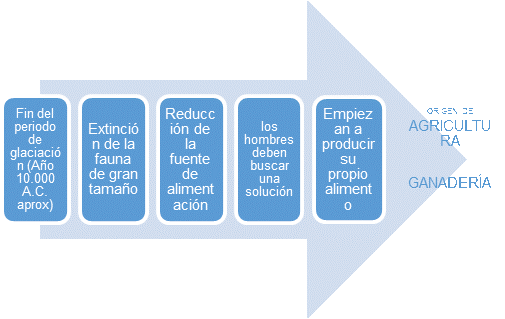 En el año 10.000 a.C., en el hemisferio norte, se produjo un aumento de la temperatura que trajo aparejado el retroceso de los hielos. La fauna de gran tamaño no pudo adaptarse al nuevo clima y una parte se extinguió. Esto produjo una reducción de las fuentes de alimentación (carne y vegetales) y provocó en la población la necesidad de procurarse otras formas de obtener alimento.