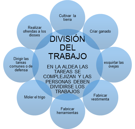 Con el tiempo, en las aldeas neolíticas las personas se fueron organizando de acuerdo a una especialización de las tareas y así surgió una división del trabajo: unos se ocupaban de la ganadería y otros de la agricultura; otros se dedicaban a realizar artesanías, a moldear cerámica o a tejer con fibras extraídas de vegetales y animales.