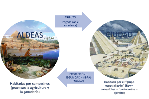 A medidas que las sociedades se asentaron definitivamente y las aldeas fueron creciendo, comenzó a surgir un grupo gobernante integrado por jefes político y funcionarios que, separándose del resto de la comunidad, fundaron las primeras ciudades. Este proceso se conoce como "Revolución Urbana". Este proceso termina creando una división entre campo/ciudad. En el campo están las aldeas con los campesinos, que son los encargados de producir el alimento. En la ciudad se encuentra el centro ceremonial o palacio donde vive el Rey con su familia y los funcionarios (clase dirigente) y el templo en los cuales están los sacerdotes, cuya función es la de realizar las tareas del culto. Además, se encuentran los artesanos (encargados de fabricar las herramientas) y los soldados que integran el ejército.